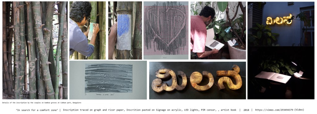 In Search of Comfort Zone is a series of works initiated from 2018. In Search of Comfort Zone emerges from my studio practice while remaining conceptually aligned with my broader engagement with public space and intimacy. During my residency at 1 Shanthiroad Studio and Gallery in Bangalore in 2018, I closely observed Cubbon Park. The park undergoes distinct social transformations throughout the day. It becomes a site of intimacy for couples of different sexuality during the daytime; by evening, it is occupied by sex workers. These shifting uses often lead authorities to discourage public displays of affection. This experience led me to examine how gender, intimacy, and moral regulation operate within public spaces across different socio-cultural contexts. I began photographing public park benches across India, as they function as primary sites of rest, proximity, and interaction. Over these photographs, I drew lines of separation, not as physical barriers but as metaphors for the invisible boundaries through which society regulates gendered intimacy in public space. Through this process, my studio practice became an extension of my public engagement, translating lived observations into layered visual interventions that question access, surveillance, and belonging. The series draws inspiration from Henri Lefebvre’s theory of the